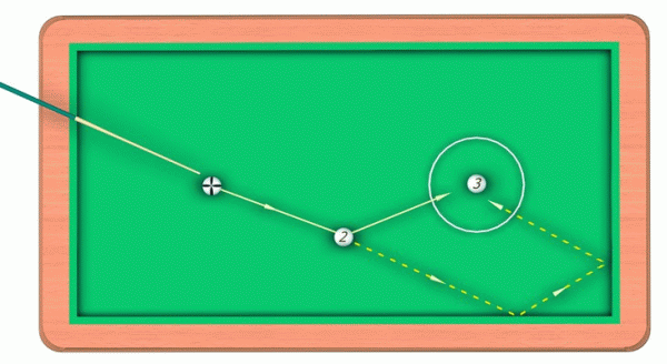 Если совершается прямой карамболь, то «свой» шар сталкивается с шарами «2» и «3», не касаясь бортов стола. Однако прицельные шары могут отражаться как от одного, так и от нескольких бортов.