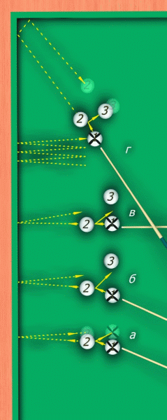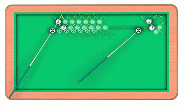 Подобная расстановка имеет большой смысл, поскольку благодаря ей можно верно выбрать точки прицела на «двойке» и «тройке». Когда «двойка» после удара отразится от бортовой резины, «тройку» следует немного подтолкнуть «своим» шаром, после чего шары займут место, исходное для следующего карамболя. Такое место окажется на соседней линии, обозначенной штрихами.