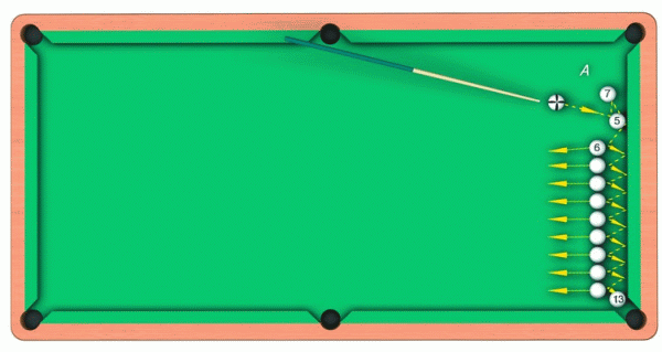 Удар по «пятерке» можно выполнять, поместив биток на точке А. В этом случае «семерку» можно будет убрать со стола. Цепь шаров должна находиться от борта игрового стола на расстоянии, равном величине, немного большей диаметра шара. Автором данного трюка считается Вилли Москони. В своей книге «Пленительный лузный бильярд» Москони называет фокус «Автоматная очередь», поскольку биток издает характерный звук при движении в направлении к прицельному шару.