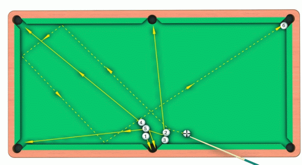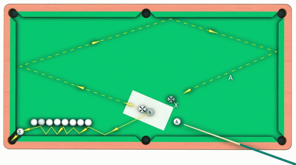 После троекратного отражения битка от бортов стола нужно взять его в руку и поставить в точку X. Затем следует нанести удар по битку с направлением в «четверку». При этом играемый шар после столкновения с битком должен будет пойти по траектории, показанной на рисунке пунктирной линией, и упасть в угловую лузу.