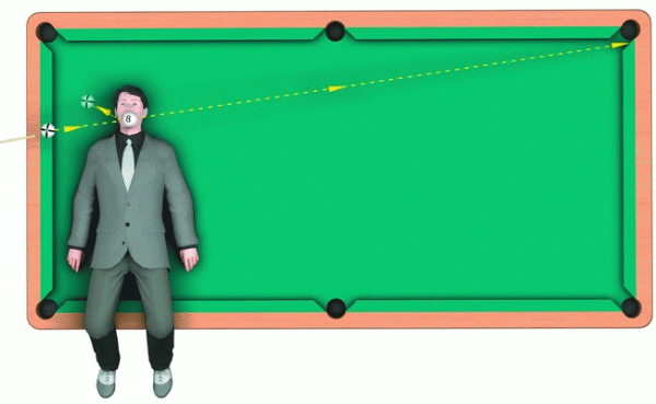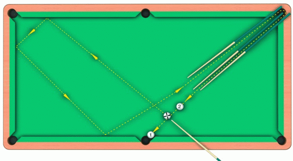 В результате проведения левого боковика «свой» шар отразится от трех бортов, затем направится вверх к угловой лузе, после чего возвратится назад и столкнет «тройку» в среднюю лузу.