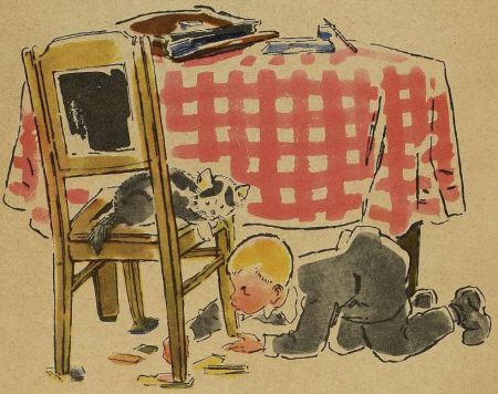 Коля притащил какие-то картонки и щепочки и стал подкладывать их то под одну ножку стула, то под другую, то под третью, то под четвёртую. Долго он подкладывал и вынимал, садился на стул, и слезал опять, и снова садился. Даже вспотел.