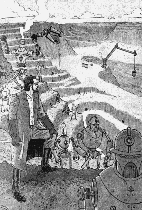 На следующее утро Левин встал раньше обыкновенного и уже хотел отправиться в шахту, но был задержан новыми сообщениями из Департамента Грозниевой Промышленности. Когда он наконец прибыл на место, механические шахтеры уже стояли у лифтов, готовые спуститься на дно. Левин надел защитные очки, покрытый свинцом костюм, ботинки на толстой подошве и прикрепил баллон с воздухом. Приблизившись к краю огромного кратера, он посмотрел вниз, на рытвину в земле; почва в этих краях была богата грозниумом, чудо-металл, словно кровь, питал собою всю Россию. Для того чтобы он стал деталью робота, нужно было изъять его из толстых каменных стен лопастями Копателей, а затем очистить. Необработанный кусок грозниума был дороже любых алмазов.