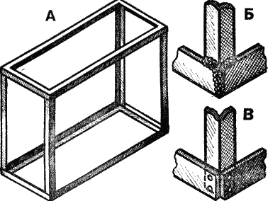 Рис. 1. Каркас аквариума (А), соединение уголков сваркой (Б) и заклепками (В)