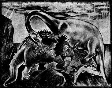 Из моря высунулась голова на очень длинной гибкой шее. Похоже было, что колоссальных размеров змея встала на хвост, раскачивается, ищет жертву. Динозавр нагнул голову, выставил шипы, и тотчас же по поверхности моря понесся странный, скрипучий звук, словно поворачивали колесо деревенского колодца.