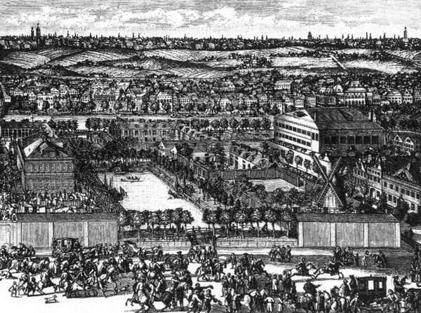Вид города Воронежа и корабельной верфи. Рисунок из книги де Брюина. 1714 г.
