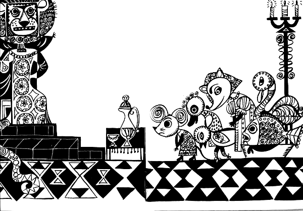 В распахнутые двери было видно, что в залах уже заняли места дикие кабаны, лисицы с роскошными хвостами, крысы с лоснящимися спинками, жирные гуси и утки, шеи которых были украшены разноцветными ожерельями. Вдоль стен стояли наполненные водой корыта, в них плескались самые крупные речные рыбы. На дворцовых дорожках резвились белки. Медленно тянулись вереницы муравьев, радовавшихся потому, что и они успели приползти вовремя. Красиво изогнув шеи, лебеди надменно посматривали на невзрачных воробьев, которые стайками вспархивали то тут, то там.