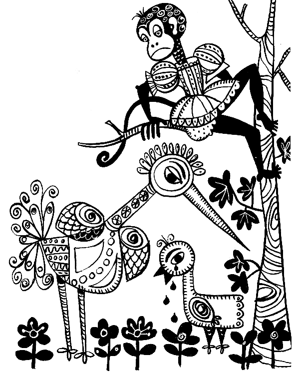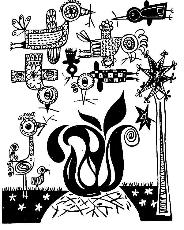 Рано утром меня потревожил яркий оранжевый свет. Я было подумал, что это встало солнце, но, открыв глаза, увидел, что среди поляны разложен большущий костер. Со всех сторон слетались к нему сотни, тысячи птиц — их было так много, что все небо буквально почернело. Одна за другой снижались они над костром и бросали в огонь сухие ветки, принесенные ими в клювах. Но что это был за костер, почему птицы поддерживали огонь?..