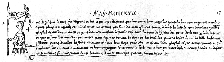 Рисунок на полях изображает «деву со знаменем» — Жанну д'Арк.