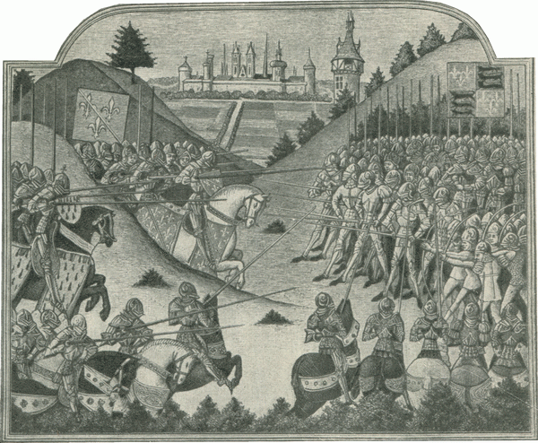 Рис. 10. Битва при Форминьи 15 апреля 1450 г. Французская конница во главе с Дюнуа, на щите которого изображены три перечеркнутые лилии, атакует английскую пехоту.