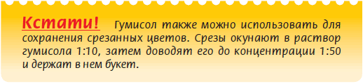 Гумисол-Н. Биостимулятор роста растений, полученный из органического сырья. Препарат улучшает прорастание семян, усиливает корнеобразование, стимулирует рост и развитие растений, повышает устойчивость к заболеваниям. Его применяют как корневую подкормку раз в месяц, разбавляя 1:10. Можно опрыскивать растения раствором гумисола 1:25 в период интенсивного роста. Посадочный материал (семена, луковицы, клубни, черенки) замачивают на сутки в растворе гумисола 1:5.