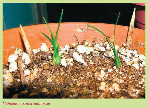 Когда у проросших сеянцев вырастет первый лист размером 8–10 см, их пересаживают в горшки диаметром 9 см в почвенную смесь, состоящую из 3 частей дерновой, 2 частей перегнойной, 2 частей листовой земли и 1 части песка. Не следует преждевременно отделять ростки от семени, так как в нем содержится необходимый для них запас питательных веществ.