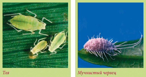 Тли, или травяные вши, представленные многочисленными видами, – наиболее распространенные вредители. По внешнему виду – это мелкие (от 0,1 до 0,7 см), сосущие насекомые, ползающие и летающие, в основном зеленого цвета, как листья и молодые побеги (бывают бурой и черной окраски). Тли поражают все растения, которые выращивают на балконах, лоджиях, подоконниках, они поселяются группами (колониями) на молодых побегах, листьях, бутонах, цветках. Этот вредитель опасен именно тем, что быстро размножается и появляется на растениях большими скоплениями. Высасывая сок, тли вызывают скручивание листьев, уродливое развитие побегов и цветков, в результате чего растение теряет декоративный вид и погибает. Осенью тли переходят на основные кормовые растения и на них откладывают оплодотворенные яйца, которые остаются зимовать на растительных остатках. Тли обладают способностью очень быстро размножаться, давая за год от 10 до 16 поколений.