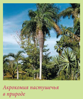 Ствол колонновидный до 6–7 м высотой, густо волосистый, со свешивающимися старыми листьями, а также шипами 2–5 см длиной. В культуре при хорошем уходе достигает высоты 3–4 м. Листья перистые, до 3,5 м длиной, поникшие; листочки 80–90 см длиной, слабоопушенные сверху, снизу сизоватые. Соцветие 0,8–1,1 м длиной, пазушное. Акрокомия пастушечья – Acrocomia armentalis / Gastrococos crispа. Родина – Куба.