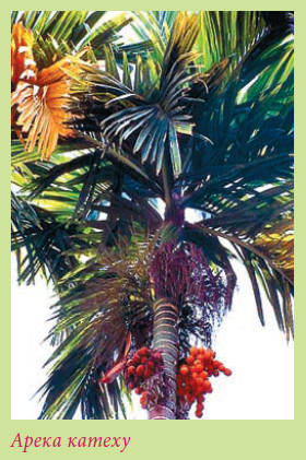Арека катеху, Бетелевая пальма – Агеса catechu. Это вечнозеленое дерево. Листья зеленой окраски, по форме слегка изогнутые, перистые, кожистые. Достигают 1,2–1,8 м в длину, состоят из 30–40 пар продолговато-ланцетных листочков с параллельными жилками.Лучшая почва состоит из дерновой и листовой земли, торфа и песка (2:2:1:1). Реакция pH слабокислая.