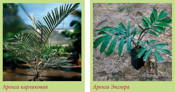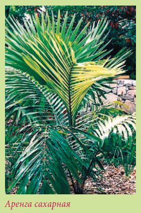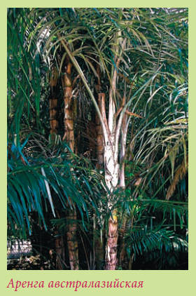 Аренга австралазийская – Arenga australasica. Родина – Австралия. Вечнозеленая пальма до 10 м высотой. Прямой стройный ствол, в рубцах. Длинные перистые листья с узколанцетными прилистниками. Плоды – мелкие округлые ягоды.
