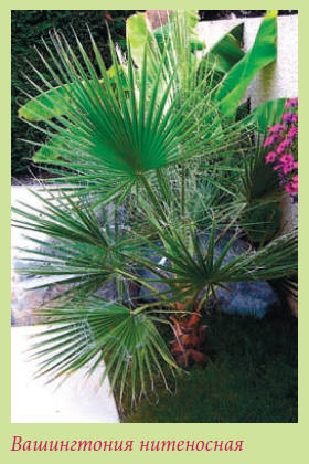 Вашингтония нитеносная – веерная пальма, широко распространенная в оранжерейной культуре. Период декоративности длится круглый год. Цветы в комнатных условиях не образуются. Взрослые растения Вашингтонии нитеносной рекомендуются для озеленения крупногабаритных помещений, зимних садов, фойе и витрин. Также используется в озеленении на солнечных подоконниках и оранжереях. Размер средней взрослой пальмы 100–250 см.