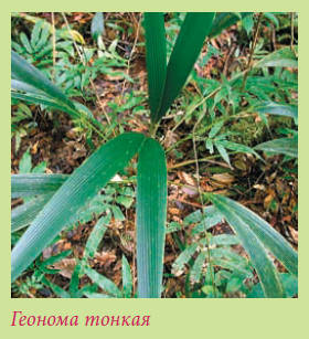 Геонома тонкая – Geonoma gracilis. Растет в тропических влажных лесах в горах на высоте 600–2000 м над уровнем моря в Коста-Рике и Панаме.Ствол тонкий, до 3 см в диаметре, 2–3 м высотой, глянцевитый, в коричневатых пятнах. Листья перистые, дуговидно поникшие, 1–1,2 м длиной; доли 25–30 см длиной и 1,5–1,8 см шириной. Соцветие пазушное, до 30 см длиной. Гетероспата – Heterospathe