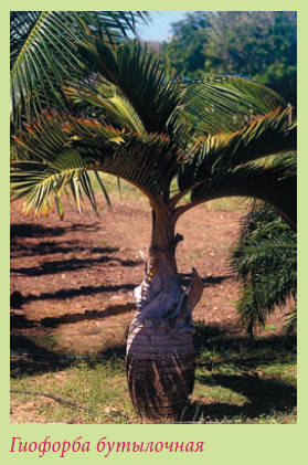Своеобразие этой пальме придает похожий на бутылку ствол, увенчанный кроной необыкновенно широких листьев. Гиофорба относится к перистым пальмам.