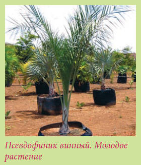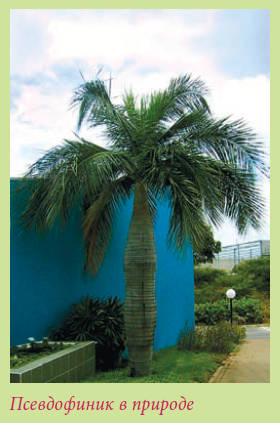 Высокоствольные пальмы. В комнатной любительской культуре выращивают молодые растения, поэтому их размеры меньше. Ствол в четко выделяющихся, близко расположенных кольцах, гладкий, глянцевитый, расширенный в нижней и особенно в верхней части (до начала кроны листьев). Листья перистые.Уход за ними осуществляется так же, как и за финиковыми пальмами в культуре. Псевдофиник винный – Pseudophoenix vinifera. Растет в саваннах на Кубе, острове Гаити, в Санто-Доминго.