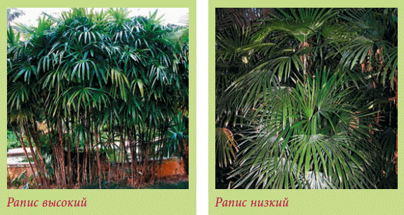 Рапис высокий – Rhapis excelsa. Тростниковидная веерная пальма до 3 м высотой. Рекомендуется для выращивания в комнатах; в зимних садах, оранжереях; в помещениях общего назначения (вестибюли, офисы и т. д.).