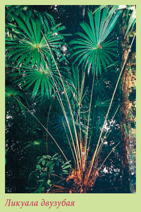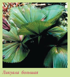 Нуждается в хорошем дренаже. Этот вид теплолюбив, зимняя температура не должна опускаться ниже 16 °C.Ликуала двузубая – Licuala bidentata. Растет в лесах Борнео. Небольшая стройная пальма. Каждый лист разделен на многочисленные тонкие сегменты с зубчатыми верхушками. Старые растения образуют короткий ствол до 1 м высотой.