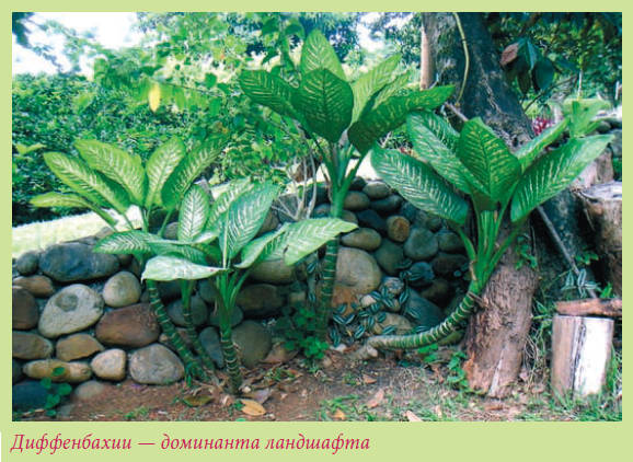 Диффенбахия – DieffenbachiaЭто вечнозеленый кустарник с прямым, крепким, зеленым стеблем. Крупные, широкие, с изумительным рисунком из светло– и желто-зеленых пятен, крапинок или полос листья являются отличительной чертой рода Диффенбахия. Великолепие окраски листьев и удивительная симметричность формы листовой пластинки этого представителя семейства Ароидных не имеют себе равных во всем растительном мире. Даже в пасмурный день растение создаст ощущение света и тепла.