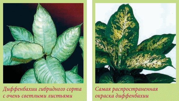 Систематика диффенбахий крайне запутана, специалистам редко удается прийти к согласию относительно названия вида. Это произошло во многом потому, что для получения декоративного эффекта виды скрещивали по нескольку раз. Полученные гибриды тоже скрещивали между собой, и теперь разобраться в этом великолепии нет никакой возможности.Единственный вид с зеленой окраской листьев, который можно встретить, – Dieffenbachia oerstdii; его можно определить по хорошо выраженной белой срединной жилке. Наиболее распространенный вид Dieffenbachia picta (Dieffenbachia maculta), с яйцевидными листьями в пятнышках цвета слоновой кости. Пятнышки имеют различную форму или сливаются в большое пятно на растениях сорта Exotica – у сортов Camila, Marianne и Rudolf Roehrs лист почти целиком кремовый или цвета слоновой кости. Dieffenbachia amoena – более крупное растение, у нее листья достигают в длину 50 см, а стебель 1,6 м в высоту. На темно-зеленых листьях – белые полоски, наиболее отчетливо выраженные у сорта Tropic Snow. Необычно выглядят желто-зеленая Dieffenbachia basei и Dieffenbachia bowmannii, у которой гигантские (до 70 см и более) листья. Взрослая диффенбахия может вырасти до 2 м и выше, но в обычных комнатных условиях нижние листья опадают и растение становится похоже на ложную пальму. Диффенбахию нелегко выращивать, она не переносит холодных сквозняков и низкой температуры зимой. Это крупное декоративно-лиственное растение любит находиться в тепле, при круглогодичной температуре минимум 18 °C, лучше выше. Некоторые капризные сорта могут погибнуть от перепада температур, но наиболее распространенные виды (Dieffenbachia picta и Dieffenbachia amoena) достаточно выносливы и хорошо растут в помещениях с центральным отоплением.