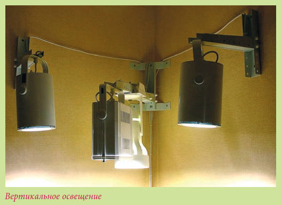 Лучше располагать лампы сверху над всей площадью, занятой растениями, но так, чтобы они не загораживали растения от естественного света и не мешали уходу за ними. В случае вертикального озеленения используют боковое освещение. В этом случае желательно разместить лампы с двух сторон, так как растения вытягиваются в сторону источника света.