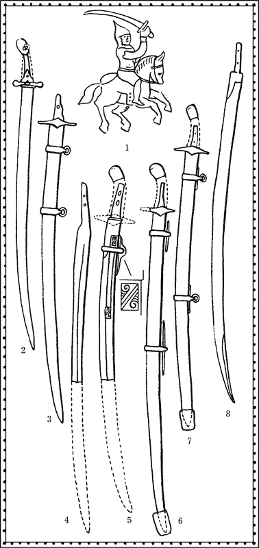 По мнению археологов, сабли того времени формой клинка напоминают шашки образца 1881 года, но длиннее их и пригодны не только для всадников, но и для пеших. В Х—ХI веках длина клинка составляла около 1 м при ширине 3,0–3,7 см, в ХII веке он удлиняется на 10–17 см и достигает ширины 4,5 см, увеличивается и изгиб. Такие же тенденции изменения свойственны и саблям наших соседей-кочевников – печенегов, половцев, венгров.