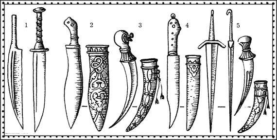 Один из этих видов оружия – большой боевой нож, или «скрамасакс». В V – начале VIII века эти ножи, длина которых достигала 0,5 м, а ширина – 2–3 см, были любимым оружием франков – группы германских племён, давших современное название Франции. В VI–VII веках кое-где на севере континентальной Европы скрамасаксы даже вытеснили из обихода обоюдоострые мечи. Другое германское племя – саксы – считало, что даже именем своим обязано этим боевым ножам, наводившим ужас на врагов. Судя по сохранившимся изображениям, носили их в ножнах, которые располагались вдоль пояса воина, горизонтально. Скрамасаксы употреблялись и в Скандинавии, и на Руси, но для IХ—Х веков это оружие было уже архаично. Находки его у нас немногочисленны, а в ХI веке скрамасакс, по-видимому, исчезает совсем.