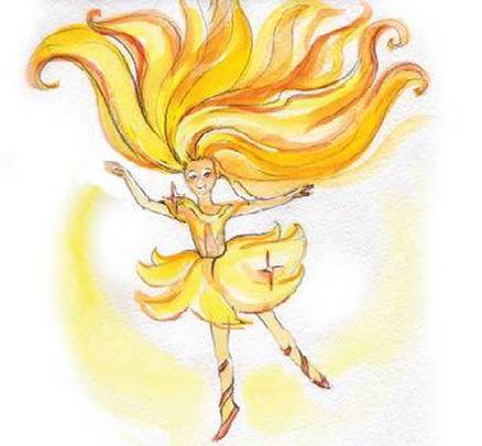 Чем ближе подлетала звезда, тем ярче она становилась. Наконец она приземлилась на лужайку рядом с фруечками и оказалось сверкающей девочкой с пышной причёской. Волосы падали до самой земли. При каждом движении от звёздочки отлетали золотистые пылинки и медленно оседали в траву.