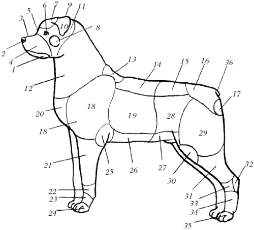 Стати ротвейлера: 1 – губа; 2 – мочка носа; 3 – спинка носа; 4 – морда; 5 – переход от лобной части к морде; 6 – глаз; 7 – лоб; 8 – скула; 9 – теменная часть; 10 – ухо; 11 – затылок (затылочный бугор); 12 – шея; 13 – холка; 14 – спина; 15 – поясничный отдел; 16 – круп; 17 – седалище (седалищный бугор); 18 – плечо; 19 – грудь (грудная клетка); 20 – передняя часть груди; 21 – предплечье; 22 – запястье; 23 – пясть; 24 – передняя лапа; 25 – локоть; 26 – нижняя часть груди; 27 – живот; 28 – пах; 29 – бедро; 30 – колено; 31 – голень; 32 – пятка; 33 – скакательный сустав; 34 – плюсна; 35 – задняя лапа; 36 – хвост