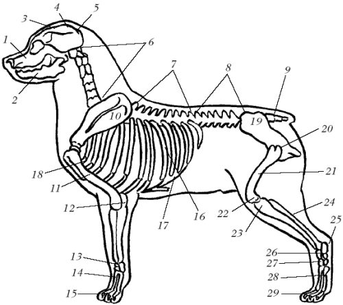 Скелет ротвейлера: 1 – верхняя челюсть; 2 – нижняя челюсть; 3 – череп; 4 – теменная кость; 5 – затылочный бугор; 6 – шейные позвонки; 7 – грудные позвонки; 8 – поясничные позвонки; 9 – хвостовые позвонки; 10 – лопатки; 11 – плечевая кость; 12 – кости предплечья; 13 – кости запястья; 14 – кости пясти; 15 – фаланги пальцев; 16 – ребра; 17 – реберные хрящи; 18 – грудина; 19 – тазовая кость; 20 – тазобедренный сустав; 21 – бедренная кость; 22 – коленный сустав; 23 – большая берцовая кость; 24 – малая берцовая кость; 25 – пяточная кость; 26 – скакательный сустав; 27 – предплюсна; 28 – плюсна; 29 – пальцы