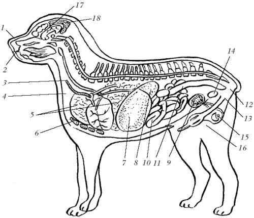 Расположение внутренних органов ротвейлера: 1 – носовая полость; 2 – ротовая полость; 3 – трахея; 4 – пищевод; 5 – легкие; 6 – сердце; 7 – печень; 8 – селезенка; 9 – почки; 10 – тонкий отдел кишечника; 11 – толстый отдел кишечника; 12 – анальное отверстие; 13 – анальные железы; 14 – мочевой пузырь; 15, 16 – половые органы; 17 – головной мозг, мозжечок; 18 – спинной мозг