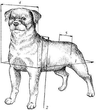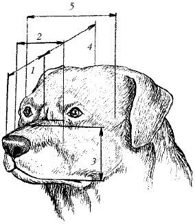 Длина головы – это расстояние от высшей точки затылочного бугра до крайней точки носа. Длина морды – расстояние, измеряемое по линии перехода ото лба к морде, от впадины между глазами до крайней точки носа.