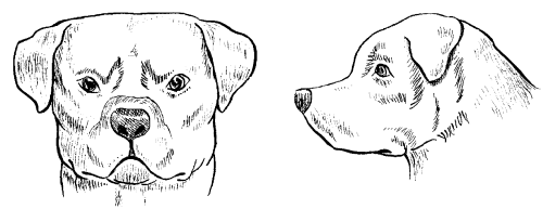 Морда у ротвейлера, имеющего слабо развитые скулы, отличается вытянутой формой, а если скуловые дуги развиты очень сильно, то морда будет выглядеть укороченной.