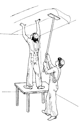 Делайте это в следующем порядке: разъединив концы полотнища, прижмите один край к потолку в месте примыкания его к стене. Помощник чистой щеткой, валиком или шваброй с поролоновой кромкой должен приглаживать оставшееся полотнище по всей длине, отступая примерно на 1 м. После чего разгладьте по потолку оставшуюся часть (рис. 1).