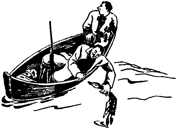 Когда гаги приблизились к первому островку, чёрная точка превратилась в лодку, и было видно, что в ней сидят два человека. Гаги скрылись за островом и не могли уже видеть, как лодка вдруг изменила курс и повернула прямо к проливу Горбатых луд. Не подозревая об этом, старая гага вела свою семью в пролив с другой стороны. Возможно, люди просто не хотели идти через мели северной оконечности луд и знали, что проход между островками глубок и безопасен; а возможно, они видели, как гаги спешили укрыться за островом, и свернули в пролив, чтобы отрезать им путь, — кто знает! Но так или иначе, лодка и гагачья семья, разделённые островком, стремительно сближались.