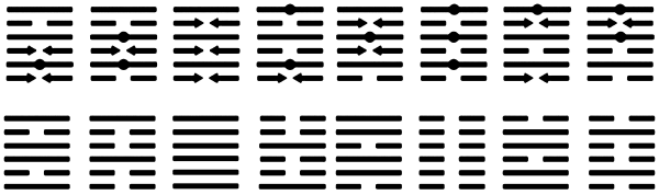 Дальше он написал программу, которая анализировала гексаграммные последовательности и статистически, отталкиваясь от количества в ней янских и иньских черт, упрощала до одной из триграмм, учитывая также и количество старых черт. Теперь любой паре вопрос-ответ в базе соответствовала одна-единственная триграмма, триграммный метатэг.