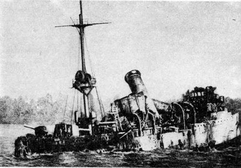 Снаряды, падавшие вблизи корабля и рвавшиеся под водой, осколками пробивали небронированный борт крейсера. Через пробоины вода вливалась в отделение торпедных аппаратов.