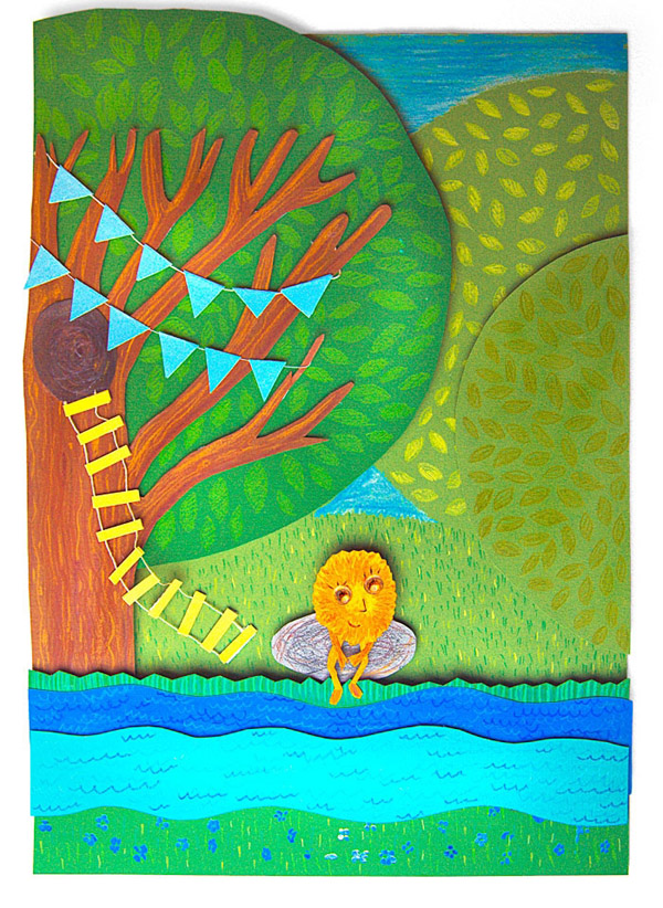 Голубым был ручеёк, который её пересекал. Голубым было небо. И кругом цвели голубые и синие цветы. На краю полянки рос старый тополь. Он не был голубым, но к празднику тополь украсили голубыми флажками. Вниз с тополя спускалась лесенка. Специальная лесенка для тех, кто не умеет летать и лазить по деревьям. Не умеет, но очень хочет. Но Рыжица этого не знала. Она даже не знала, умеет она карабкаться по деревьям или нет. Поэтому Рыжица обошла тополь и остановилась у ручейка.