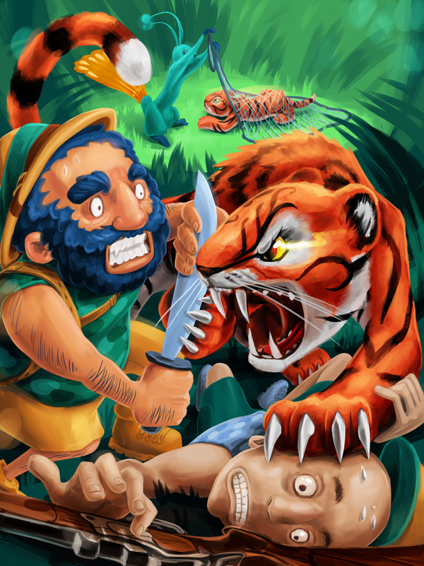 «Надо выручать Рыка», – решил Хрум и бесстрашно бросился к ловушке, в которую тот угодил. Своими ловкими лапками с присосками он быстро распутал сетку и помог тигрёнку выбраться на волю. Рык присел и, оттолкнувшись всеми четырьмя лапами, бросился на чернобородого, сбив его с ног.