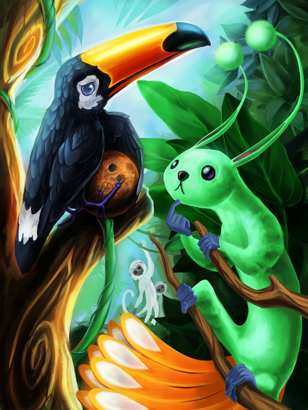 Странный зверёк хотел сообщить Тукану, что зовут его Хрум-Хрумиком, но не успел. В то самое мгновение, когда он приоткрыл рот, птица с такой яростью клюнула зажатый в лапах орех, будто именно он, а не назойливый Хрумик, задавал ей вопрос за вопросом. Покрытый плотной волокнистой оболочкой плод кокосовой пальмы, наконец, раскололся и брызнул во все стороны густой белой жидкостью. Напившись, птица как-то сразу стала добрее. С высоты своего положения она снисходительно посмотрела на застывшего в просительной позе зеленошёрстного зверька и проговорила: