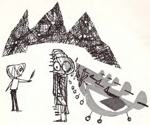 Оставалась третья, последняя, тропинка. Она вела не прямо к вершине, а петляла по склону. Мальчуган тронулся по ней. Тропинка оканчивалась ровной площадкой. На краю площадки стояло несколько небольших самолетов с серебряными крыльями. «Интересно, как управляют самолетом?