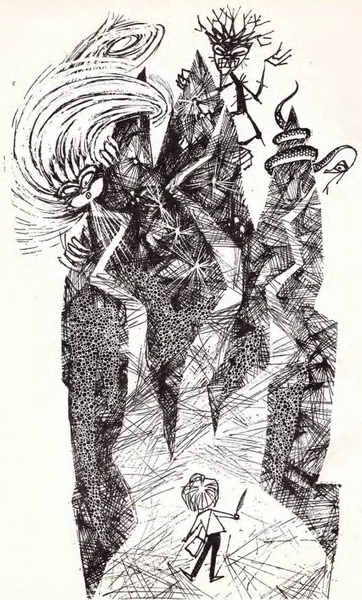 – До сих пор еще никто не добирался до вершин. К первой ведет ледяная тропинка, на склоне второй растут непроходимые колючки, а если ты тронешься к третьей, то попадешь в царство ядовитых змей.