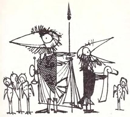 Тогда Чудо-птица решила улететь туда, где еще есть цветы, яркие краски, песни, заручиться помощью доброго волшебника, который бы вернул нашему городу прежний вид. Она, бедняга, не знала, что Государь ко всему еще и злой волшебник. Она тронулась в путь, не подозревая, что над ней тяготеет его проклятие. Оно поразило Чудо-птицу, как только она покинула пределы нашей страны: красавица вдруг оглохла и онемела. Так мир лишился возможности узнать правду о нашей стране...