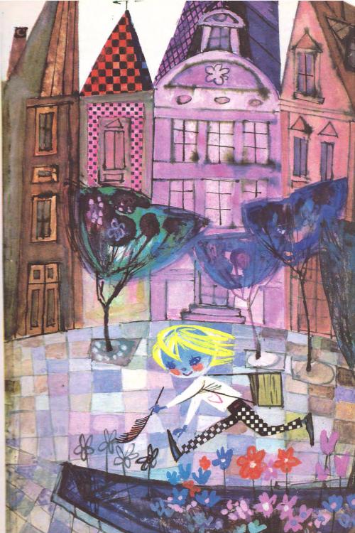 Первым делом он покрасил дома в различные цвета. Расцветил занавески на окнах, автомобили, стоявшие вдоль тротуаров, материи в витринах магазинов, так что они перестали походить одна на другую. На ветвях деревьев появились зеленые листья, голую землю покрыла трава, всюду показались цветы, много цветов - один другого пестрее и ярче.