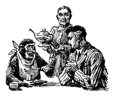 Перша ж зустріч показала, що Сімка не забув професора. Матуся, який спостерігав цю сцену, був зворушений поривом ніжності мавпи. Невдовзі з’ясувалося, що Сімка взагалі нічого не забув. З кабінету всі троє пішли в їдальню обідати. Нікого з молоді в цей день не було: рано-вранці вони вирушили в якусь екскурсію за місто. Ридан, звичайно, не пропустив нагоди обставити появу Сімки з відповідним ефектом; вони сіли за стіл у той момент, коли тітка Паша вийшла на кухню. Незабаром вона повернулася назад. Сімка сидів праворуч від професора. Груди його були пов’язані серветкою, у руці він тримав чашку. Бородата потвора, обрамлена чорним волоссям, що стирчало в усі боки, очікувально і, здавалось, байдуже дивилась на тітку Пашу, людину ще незнайому.