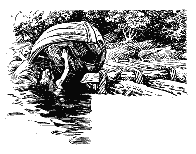Тим часом човен виходить на бистрину, мчить вниз і, підхоплений течією, знову відхиляється од берега, на якому розташований табір. А попереду — трохи нижче — якийсь випадковий широкий пліт, причалений до берега товстим канатом. Струмінь течії зникає під ним, дзюркочучи біля передньої лінії зв’язаних колод.